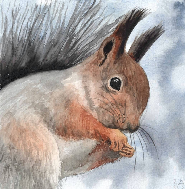 Wusstest Du, dass Eichhörnchen nur um die 80 Gramm pro Tag fressen? Das ist ungefähr ein Viertel ihres Körpergewichts. Im Winter fressen sie nur halb so viel. Die Fellfarbe ändert sich auch ein wenig. Im Winter beweist das Eichhörnchen Mut und Geschick beim Aufsuchen der Nahrungsverstecke, und dieses hier hat sich gerade eine saftige Haselnuss geholt. Ich liebe an diesem Hörnchen die langen Häärchen an den Ohren und die zwei verschiedenen Fellfarben. Und das Auge und das Näschen...eigentlich alles!