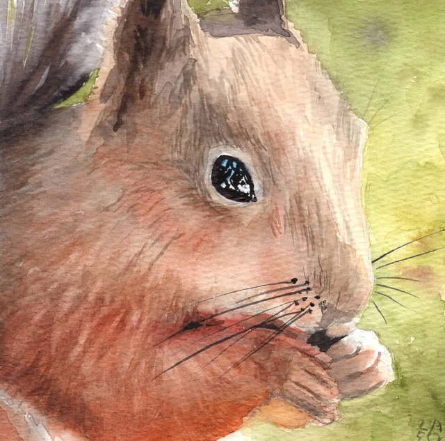 Zu diesem Motiv stelle mir einen Nachmittag im goldenen Herbst vor, an dem dieses Eichhörnchen emsig Vorräte zusammen sucht für den Winter. Alle Nüsse müssen versteckt werden und niemand darf sehen, wo die Verstecke sind. Das ist ganz schön schwer! Vor allem, wenn Krähen und andere Eichhörnchen betont gelangweilt herumlungern und einen nicht aus den Augen lassen. So wird das nichts! Hier pausiert das Eichhörnchen deswegen kurz und genießt eben einfach eine leckere Nuss. Das Licht wärmt wunderbar von rechts und das rote Fell leuchtet zauberhaft.
